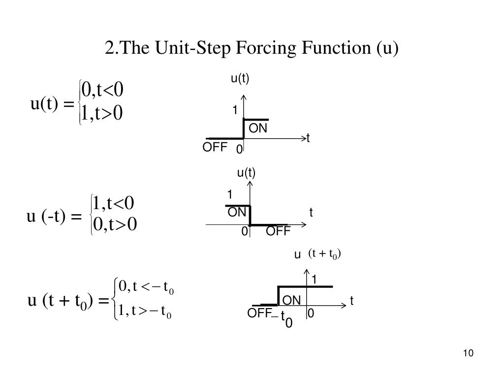 1 ON t OFF 0 1 ON t ON t 0 2.The Unit-Step Forcing Function (u) u(t) u(t) = u(t) u (-t) = 0 OFF (t + t0) u 1 u (t + t0) = OFF