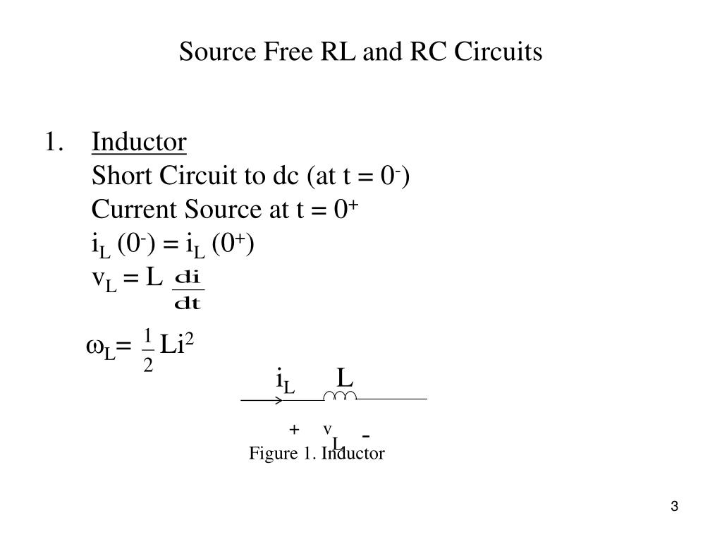 Source Free RL and RC Circuits • Inductor Short Circuit to dc (at t = 0-) Current Source at t = 0+ iL (0-) = iL (0+) vL = L L= Li2 iL L + vL - Figure 1. Inductor