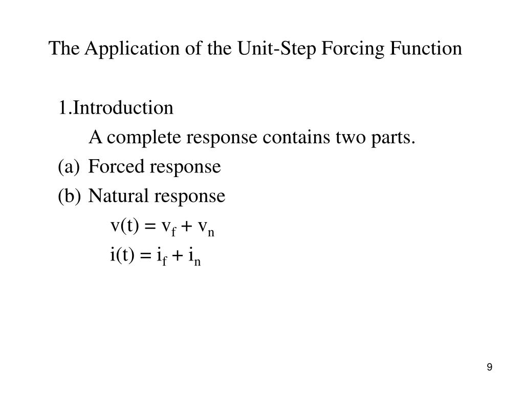 The Application of the Unit-Step Forcing Function 1.Introduction A complete response contains two parts. • Forced response • Natural response v(t) = vf + vn i(t) = if + in