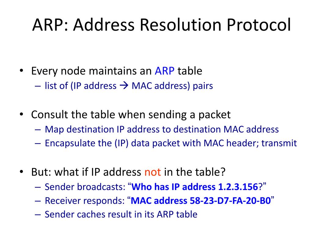 ARP: Address Resolution Protocol • Every node maintains an ARP table • list of (IP address MAC address) pairs • Consult the table when sending a packet • Map destination IP address to destination MAC address • Encapsulate the (IP) data packet with MAC header; transmit • But: what if IP address not in the table? • Sender broadcasts: “Who has IP address 1.2.3.156?” • Receiver responds: “MAC address 58-23-D7-FA-20-B0” • Sender caches result in its ARP table