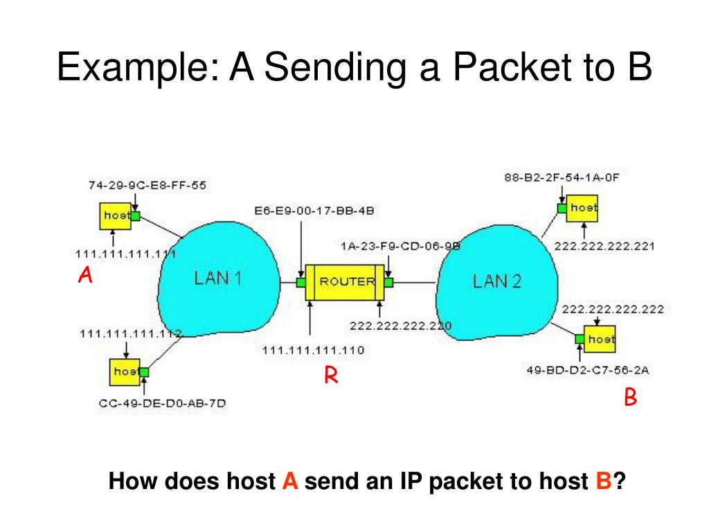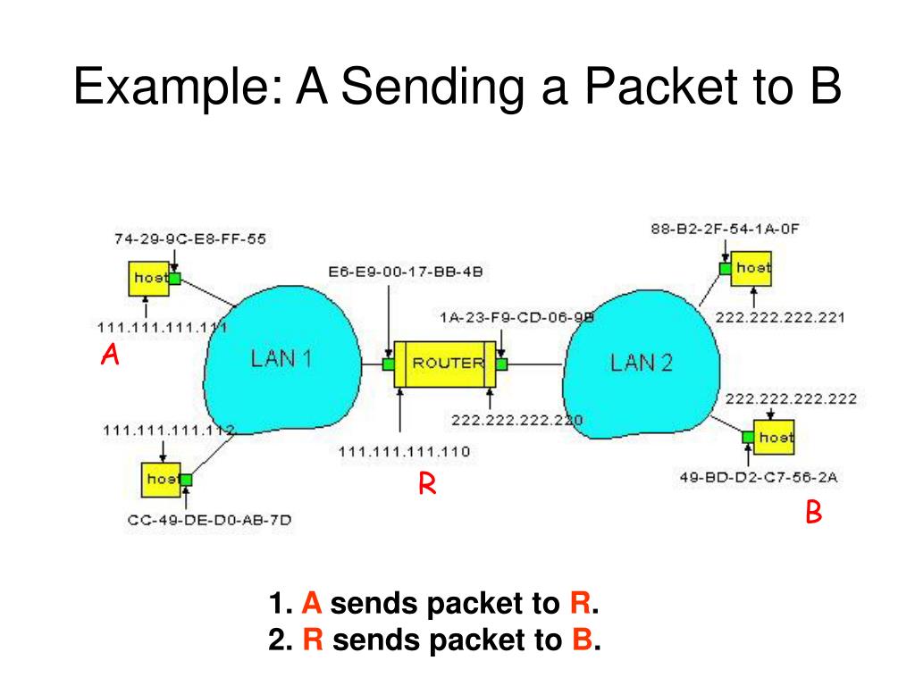 Example: A Sending a Packet to B A R B 1. A sends packet to R.2. R sends packet to B.