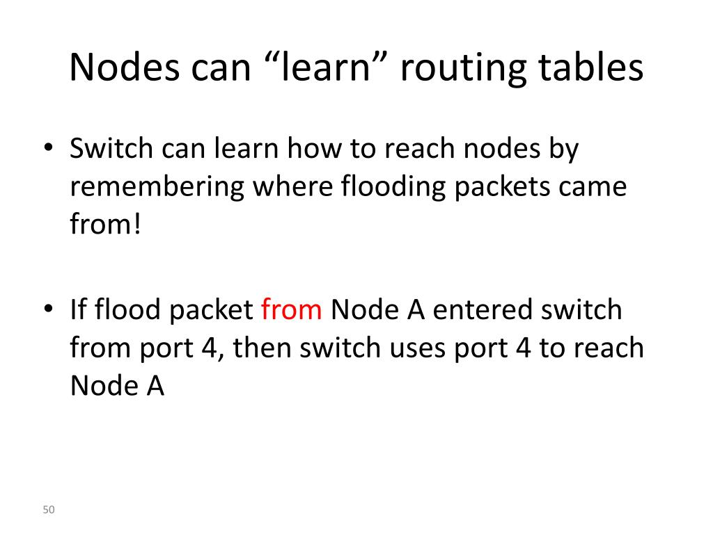 Nodes can “learn” routing tables • Switch can learn how to reach nodes by remembering where flooding packets came from! • If flood packet from Node A entered switch from port 4, then switch uses port 4 to reach Node A