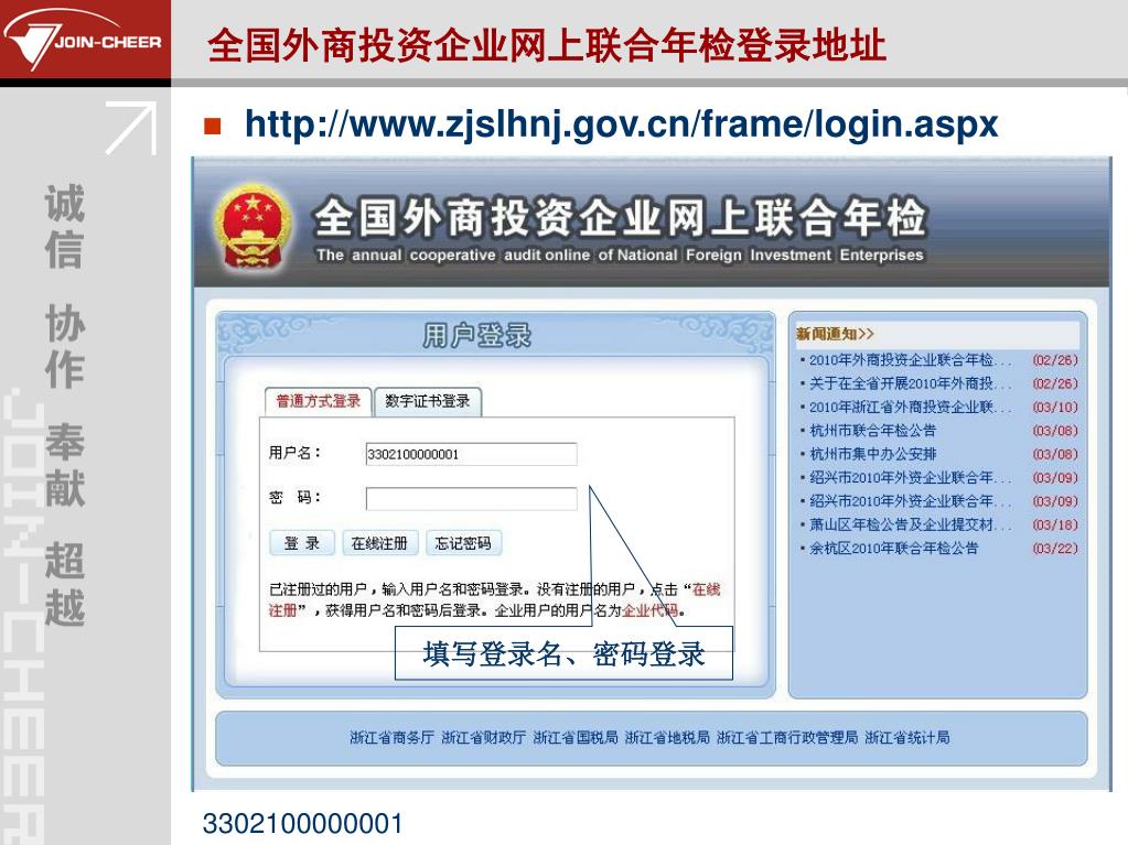 全国外商投资企业网上联合年检登录地址 • http://www.zjslhnj.gov.cn/frame/login.aspx 填写登录名、密码登录 3302100000001