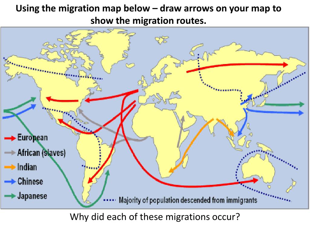 Using the migration map below – draw arrows on your map to show the migration routes. Why did each of these migrations occur?