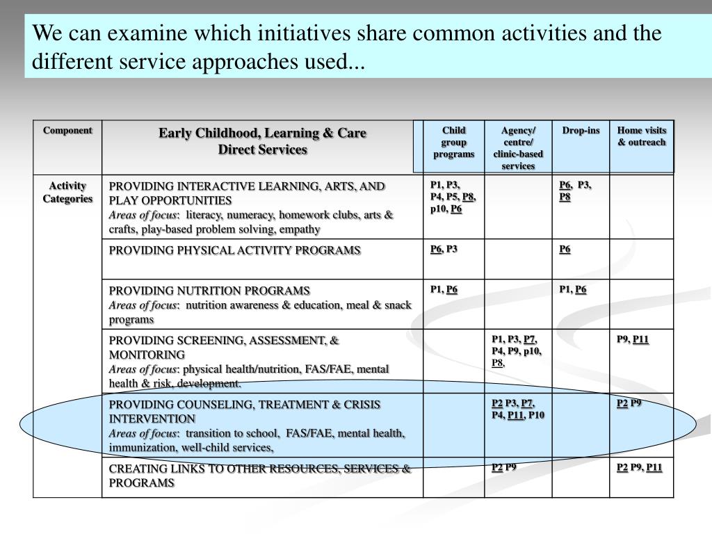 We can examine which initiatives share common activities and the different service approaches used...