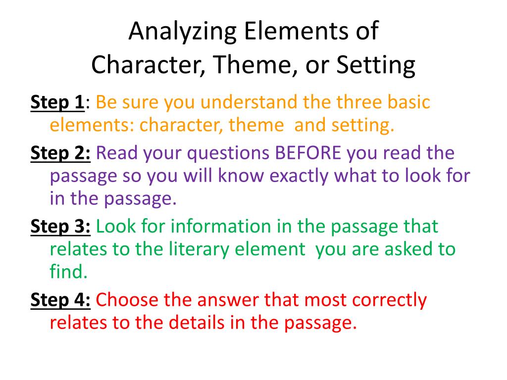 Analyzing Elements of Character, Theme, or Setting Step 1: Be sure you understand the three basic elements: character, theme and setting. Step 2:Read your questions BEFORE you read the passage so you will know exactly what to look for in the passage. Step 3:Look for information in the passage that relates to the literary element you are asked to find. Step 4:Choose the answer that most correctly relates to the details in the passage.