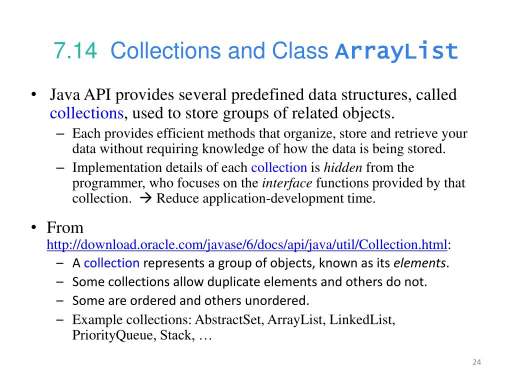 7.14 Collections and Class ArrayList • Java API provides several predefined data structures, called collections, used to store groups of related objects. • Each provides efficient methods that organize, store and retrieve your data without requiring knowledge of how the data is being stored. • Implementation details of each collection is hidden from the programmer, who focuses on the interface functions provided by that collection. Reduce application-development time. • From http://download.oracle.com/javase/6/docs/api/java/util/Collection.html: • A collection represents a group of objects, known as its elements. • Some collections allow duplicate elements and others do not. • Some are ordered and others unordered. • Example collections: AbstractSet, ArrayList, LinkedList, PriorityQueue, Stack, …