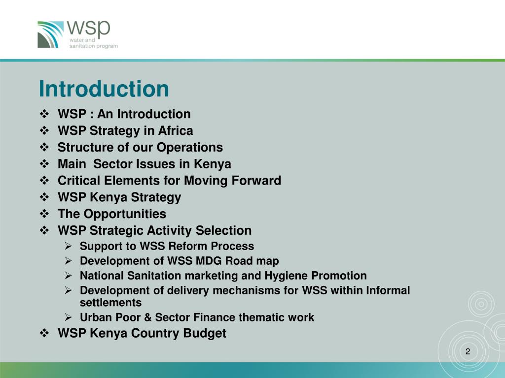 Introduction • WSP : An Introduction • WSP Strategy in Africa • Structure of our Operations • Main Sector Issues in Kenya • Critical Elements for Moving Forward • WSP Kenya Strategy • The Opportunities • WSP Strategic Activity Selection • Support to WSS Reform Process • Development of WSS MDG Road map • National Sanitation marketing and Hygiene Promotion • Development of delivery mechanisms for WSS within Informal settlements • Urban Poor & Sector Finance thematic work • WSP Kenya Country Budget