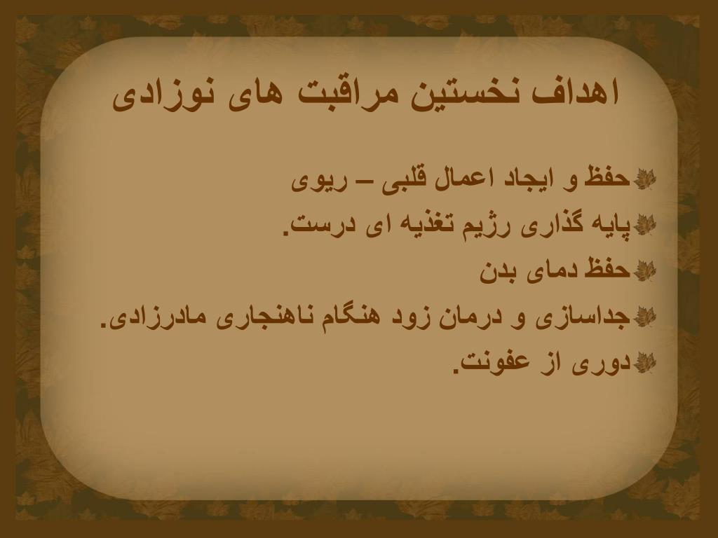 اهداف نخستین مراقبت های نوزادی • حفظ و ایجاد اعمال قلبی – ریوی • پایه گذاری رژیم تغذیه ای درست. • حفظ دمای بدن • جداسازی و درمان زود هنگام ناهنجاری مادرزادی. • دوری از عفونت.