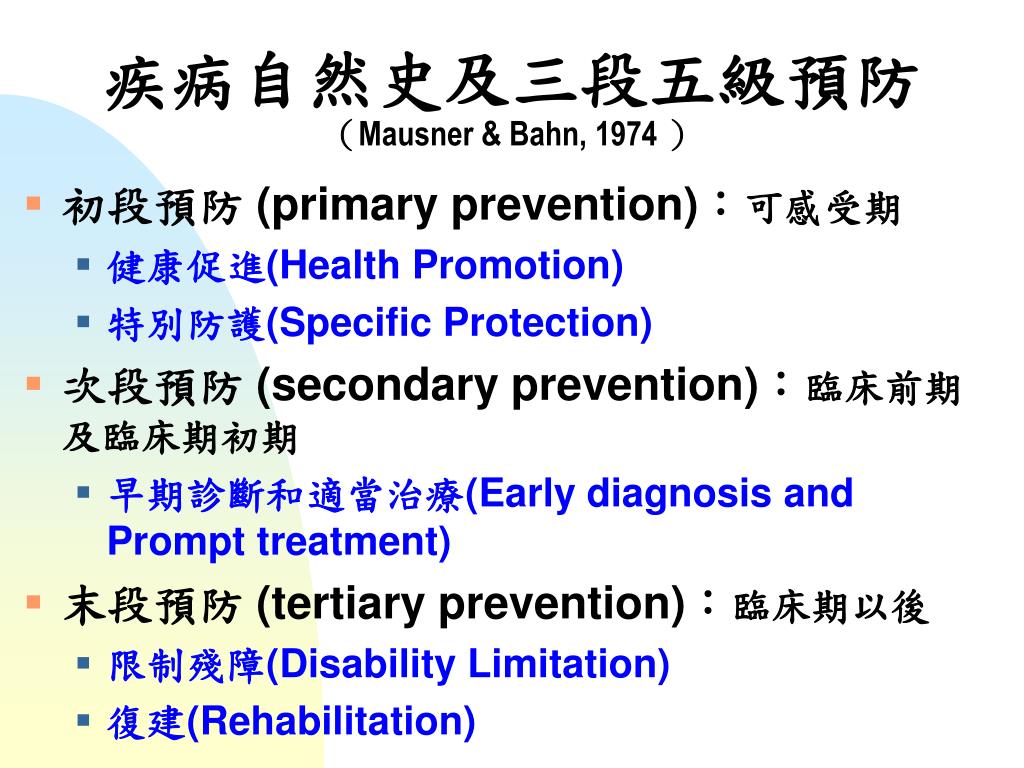 疾病自然史及三段五級預防(Mausner & Bahn, 1974 ) • 初段預防 (primary prevention):可感受期 • 健康促進(Health Promotion) • 特別防護(Specific Protection) • 次段預防 (secondary prevention):臨床前期及臨床期初期 • 早期診斷和適當治療(Early diagnosis and Prompt treatment) • 末段預防 (tertiary prevention):臨床期以後 • 限制殘障(Disability Limitation) • 復建(Rehabilitation)