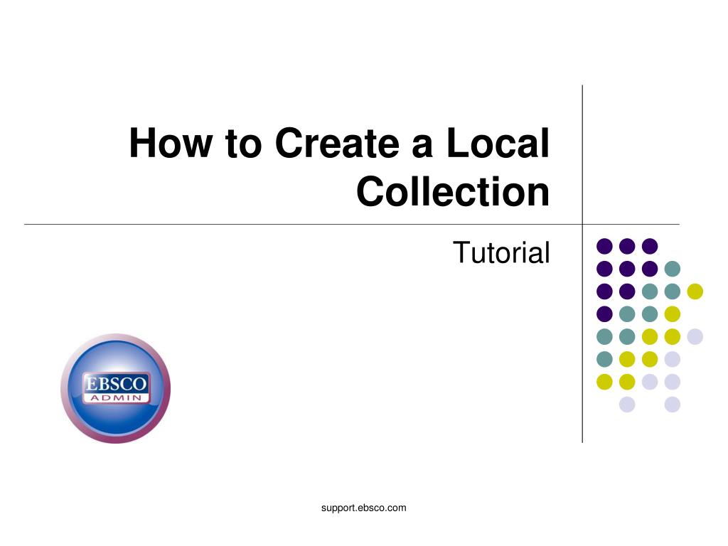 How to Create a Local Collection. Tutorial. Welcome to EBSCO’s tutorial on How to Create a Local Collection in EBSCO admin. Local Collections can be used as EBSCO host search limiters, or as authority files that appear along the top