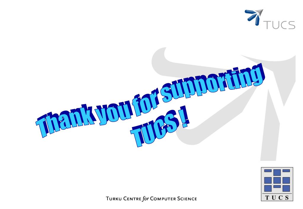 2007 Industrial TUCS 2006 2005 2004 2003 • Expand TUCS into a national player in IT industry • Make TUCS into an independent center that is affiliated with the universities, but manages its own finances • Could be jointly (partly?) owned by the universities • Should make profit in one way or the other, to finance its activities • Financing need not all come from industry, could also come from government and EU sources. • Focus activities on areas where there is strong competence and demand for service • Responsive to industry demands (VTT model?) 2002 2001 2000 1999 1998 1997 1996 1995 1994 1993 1992 1991
