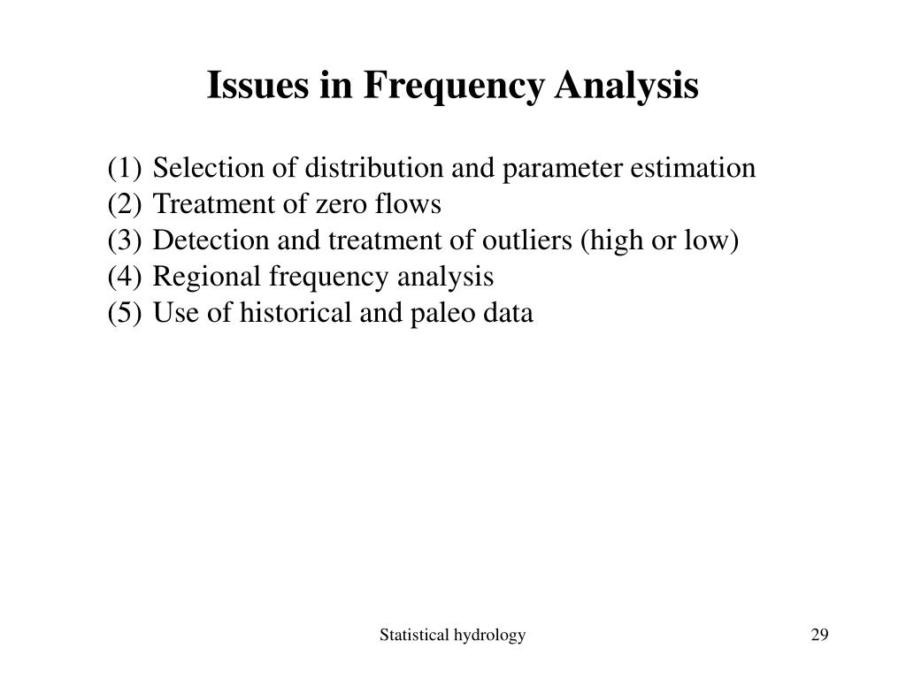 Issues in Frequency Analysis • Selection of distribution and parameter estimation • Treatment of zero flows • Detection and treatment of outliers (high or low) • Regional frequency analysis • Use of historical and paleo data Statistical hydrology
