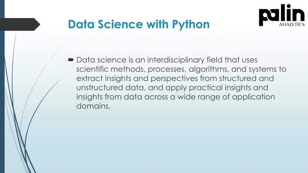 Data Science with Python • Data science is an interdisciplinary field that uses scientific methods, processes, algorithms, and systems to extract insights and perspectives from structured and unstructured data, and apply practical insights and insights from data across a wide range of application domains.