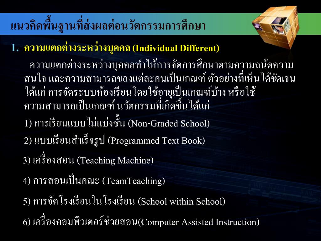 แนวคิดพื้นฐานที่ส่งผลต่อนวัตกรรมการศึกษาแนวคิดพื้นฐานที่ส่งผลต่อนวัตกรรมการศึกษา • ความแตกต่างระหว่างบุคคล (Individual Different) ความแตกต่างระหว่างบุคคลทำให้การจัดการศึกษาตามความถนัดความสนใจ และความสามารถของแต่ละคนเป็นเกณฑ์ ตัวอย่างที่เห็นได้ชัดเจนได้แก่ การจัดระบบห้องเรียนโดยใช้อายุเป็นเกณฑ์บ้าง หรือใช้ความสามารถเป็นเกณฑ์ นวัตกรรมที่เกิดขึ้นได้แก่ 1)การเรียนแบบไม่แบ่งชั้น (Non-Graded School) 2)แบบเรียนสำเร็จรูป (Programmed Text Book) 3) เครื่องสอน (Teaching Machine) 4) การสอนเป็นคณะ (TeamTeaching) 5) การจัดโรงเรียนในโรงเรียน (School within School) 6) เครื่องคอมพิวเตอร์ช่วยสอน(Computer Assisted Instruction)