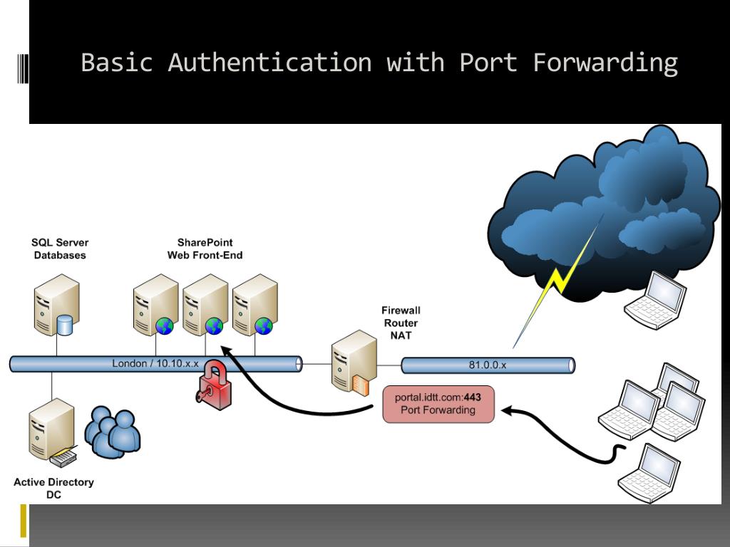 Basic Authentication with Port Forwarding • Simplest to deploy • Less secure direct access to the farm • Must use public certificates on the farm • NTLM would require custom IE configuration and has performance problems