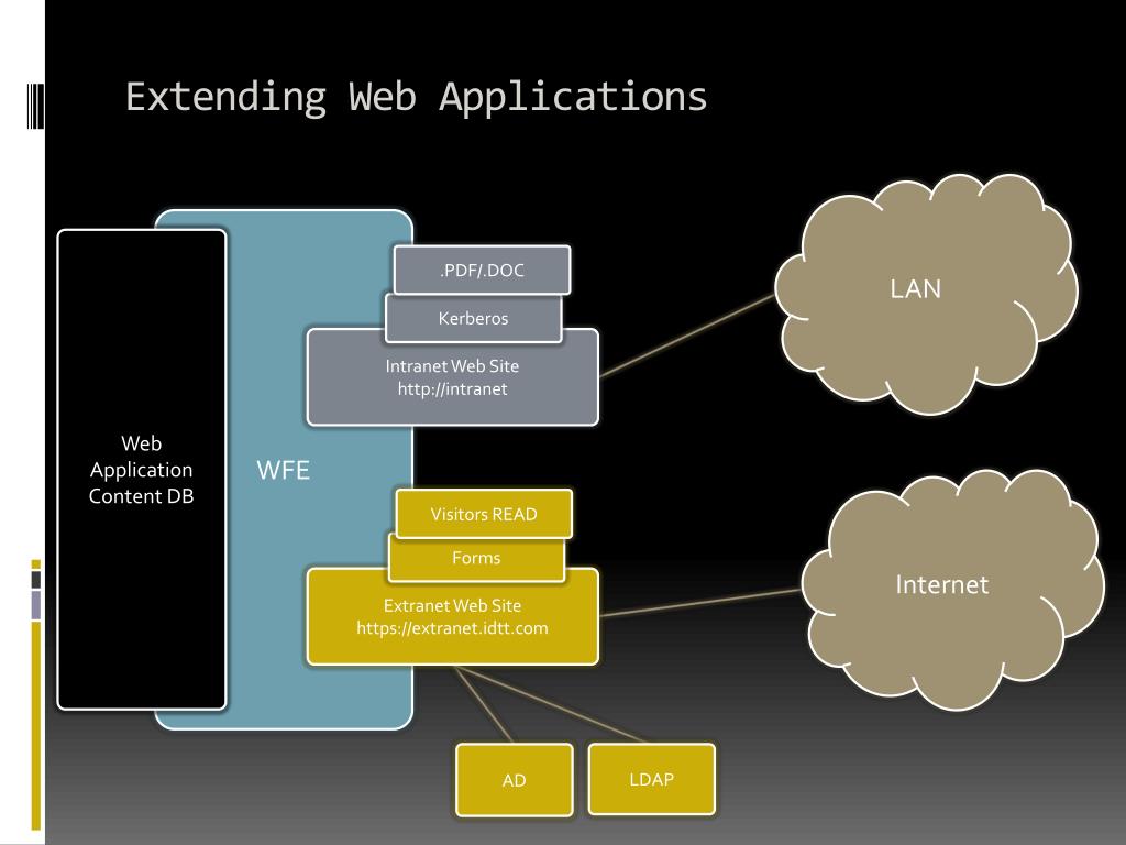 Extending Web Applications LAN WFE Web Application Content DB .PDF/.DOC Kerberos Intranet Web Site http://intranet Internet Visitors READ Forms Extranet Web Site https://extranet.idtt.com AD LDAP