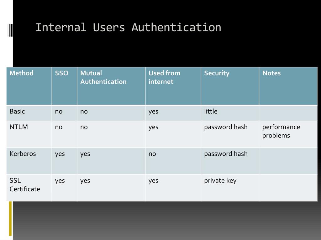 SharePoint Authentication for Internal Users • Basic • plaintext password • works from internet • no SSO • NTLM • less secure, MD5 • performance problems at 200 +/- users per WFE • no SSO • Kerberos • secure, mutual authentication, AES, smart cards • faster, smoother • intranet only • SSL Client Certificates • the most secure, mutual authentication • SSO from outside