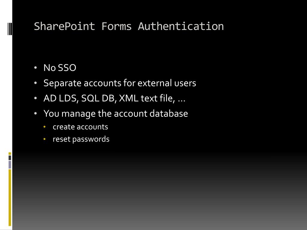 SharePoint Forms Authentication • No SSO • Separate accounts for external users • AD LDS, SQL DB, XML text file, ... • You manage the account database • create accounts • reset passwords