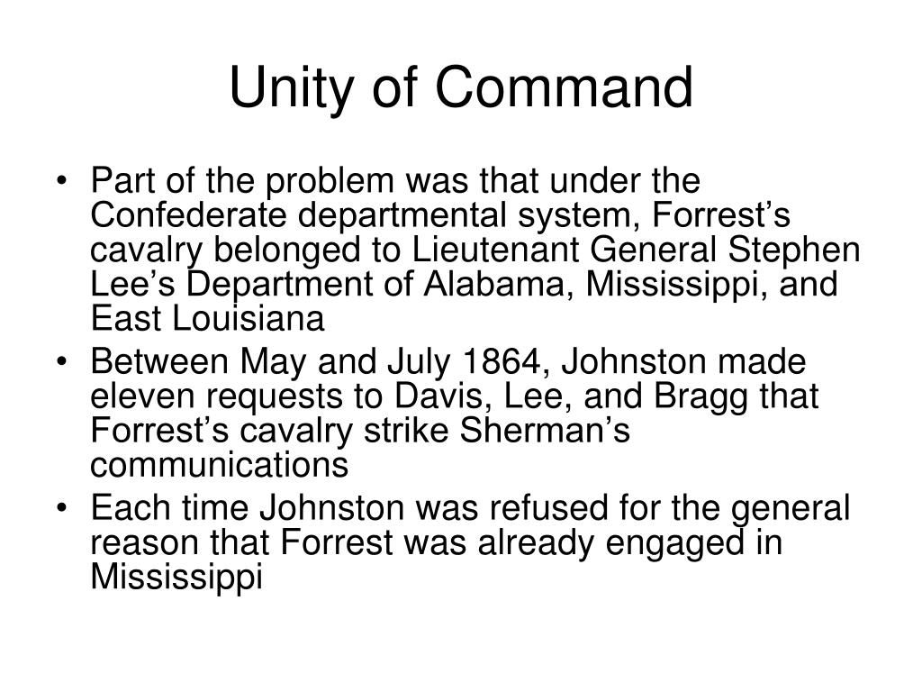 Unity of Command • Part of the problem was that under the Confederate departmental system, Forrest’s cavalry belonged to Lieutenant General Stephen Lee’s Department of Alabama, Mississippi, and East Louisiana • Between May and July 1864, Johnston made eleven requests to Davis, Lee, and Bragg that Forrest’s cavalry strike Sherman’s communications • Each time Johnston was refused for the general reason that Forrest was already engaged in Mississippi