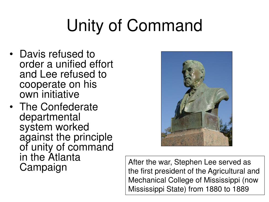 Unity of Command • Davis refused to order a unified effort and Lee refused to cooperate on his own initiative • The Confederate departmental system worked against the principle of unity of command in the Atlanta Campaign After the war, Stephen Lee served as the first president of the Agricultural and Mechanical College of Mississippi (now Mississippi State) from 1880 to 1889