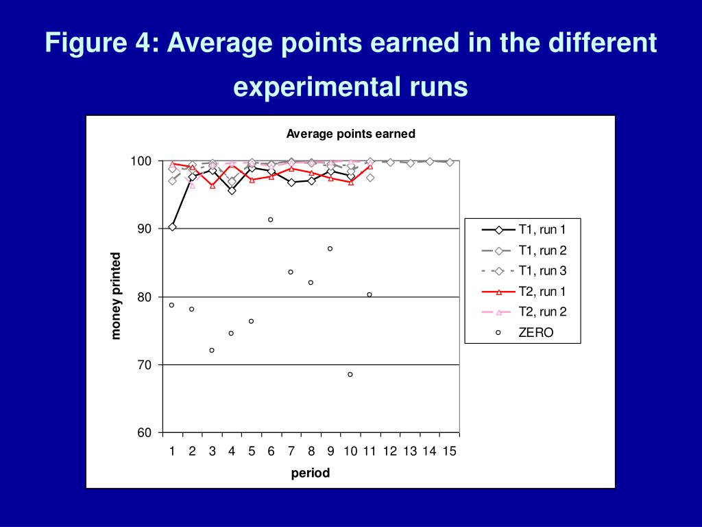 Acceptability of Government Money • No bank (much less individual) can match the visibility of government, • Government’s reputation is known to all • Government is better able to enforce the rules of the game • Government money expedited and simplified taxation as an unintended (?) consequence • Handed to government additional policy options (e.g., financing of wars and control of economy) • Acceptability of IOUs involves trust and trust in government may be higher in most instances than in even big banks (individuals have little chance) • Everyone-a-banker game could be seen as a simplified version of governments issuing their own money in the international exchanges to settle their payments • In the experiment presented here, we cleanse the lab economy of such frictional and informational issues to ask if the logical possibility of private money economy is also a behavioral possibility