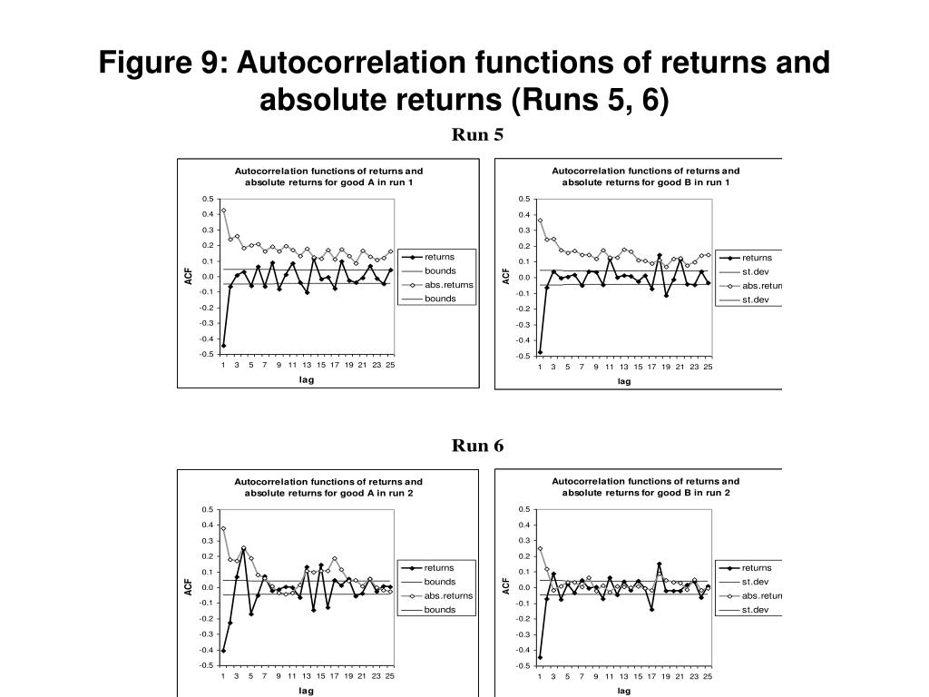 Figure 9: Autocorrelation functions of returns and absolute returns (Runs 5, 6)
