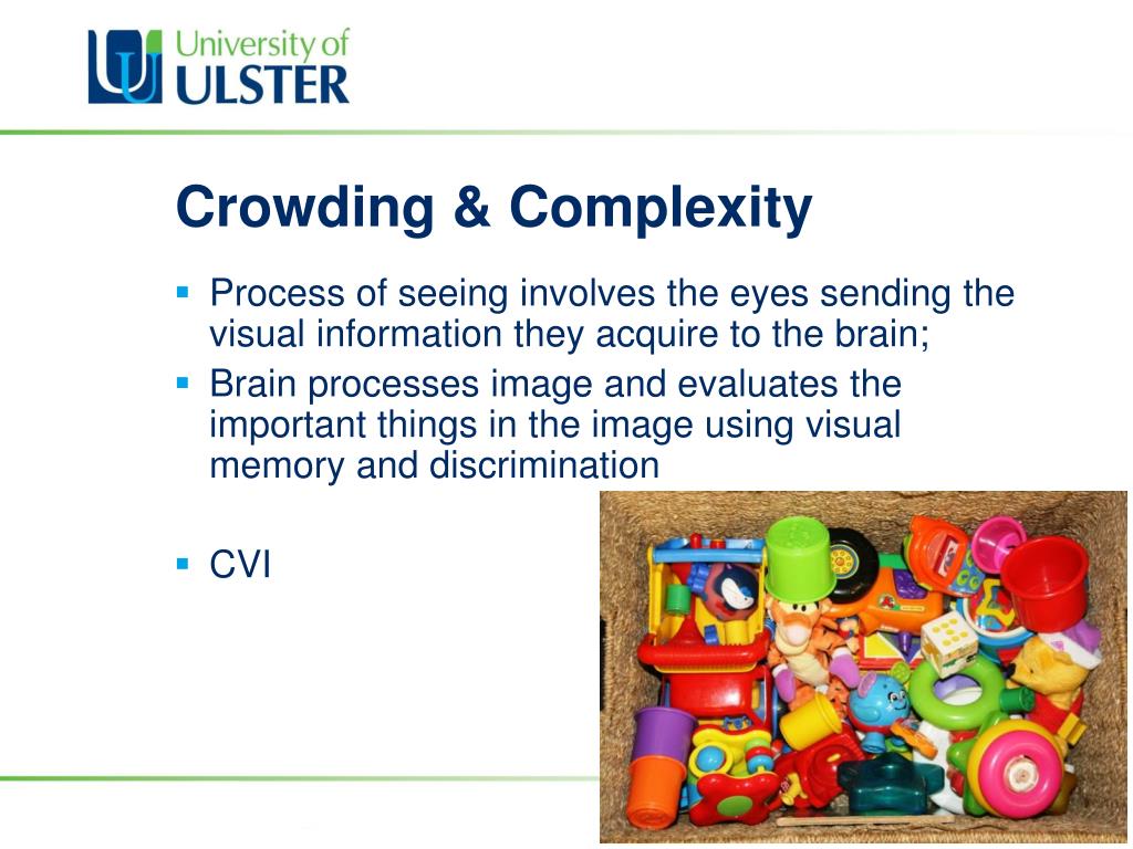 Crowding & Complexity • Process of seeing involves the eyes sending the visual information they acquire to the brain; • Brain processes image and evaluates the important things in the image using visual memory and discrimination • CVI