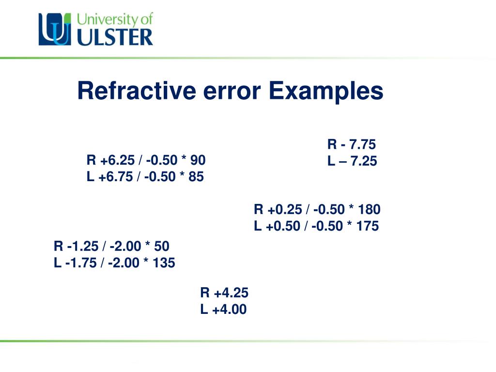 Refractive error Examples R - 7.75 L – 7.25 R +6.25 / -0.50 * 90 L +6.75 / -0.50 * 85 R +0.25 / -0.50 * 180 L +0.50 / -0.50 * 175 R -1.25 / -2.00 * 50 L -1.75 / -2.00 * 135 R +4.25 L +4.00