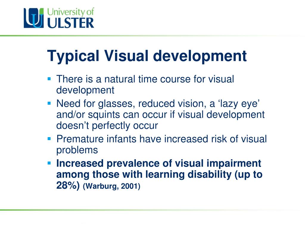 Typical Visual development • There is a natural time course for visual development • Need for glasses, reduced vision, a ‘lazy eye’ and/or squints can occur if visual development doesn’t perfectly occur • Premature infants have increased risk of visual problems • Increased prevalence of visual impairment among those with learning disability (up to 28%) (Warburg, 2001)