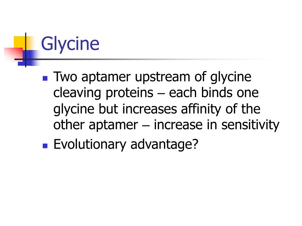 Glycine • Two aptamer upstream of glycine cleaving proteins – each binds one glycine but increases affinity of the other aptamer – increase in sensitivity • Evolutionary advantage?