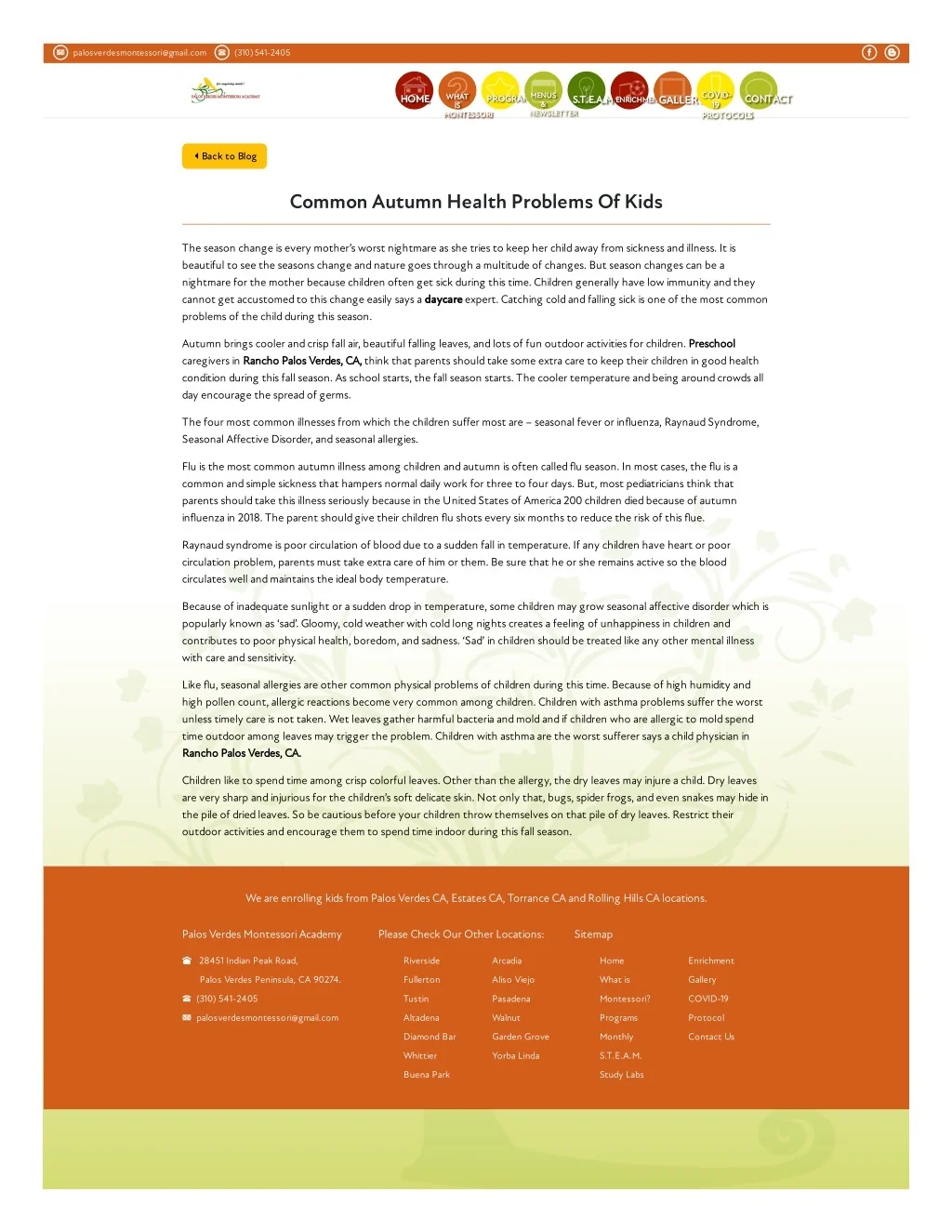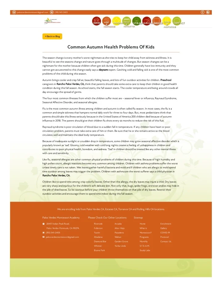 palosverdesmontessori@gmail.com (310) 541-2405 COVID- 19 19 PROTOCOLS PROTOCOLS MENUS & & NEWSLETTER NEWSLETTER GALLERYCOVID- WHAT WHAT IS IS MONTESSORI MONTESSORI PROGRAMS PROGRAMSMENUS HOME HOME CONTACT CONTACT S.T.E.A.M S.T.E.A.M ENRICHMENT ENRICHMENTGALLERY Back to Blog Common Autumn Health Problems Of Kids The season change is every mother’s worst nightmare as she tries to keep her child away from sickness and illness. It is beautiful to see the seasons change and nature goes through a multitude of changes. But season changes can be a nightmare for the mother because children often get sick during this time. Children generally have low immunity and they cannot get accustomed to this change easily says a daycare expert. Catching cold and falling sick is one of the most common problems of the child during this season. Autumn brings cooler and crisp fall air, beautiful falling leaves, and lots of fun outdoor activities for children. Preschool caregivers in Rancho Palos Verdes, CA, think that parents should take some extra care to keep their children in good health condition during this fall season. As school starts, the fall season starts. The cooler temperature and being around crowds all day encourage the spread of germs. The four most common illnesses from which the children suffer most are – seasonal fever or influenza, Raynaud Syndrome, Seasonal Affective Disorder, and seasonal allergies. Flu is the most common autumn illness among children and autumn is often called flu season. In most cases, the flu is a common and simple sickness that hampers normal daily work for three to four days. But, most pediatricians think that parents should take this illness seriously because in the United States of America 200 children died because of autumn influenza in 2018. The parent should give their children flu shots every six months to reduce the risk of this flue. Raynaud syndrome is poor circulation of blood due to a sudden fall in temperature. If any children have heart or poor circulation problem, parents must take extra care of him or them. Be sure that he or she remains active so the blood circulates well and maintains the ideal body temperature. Because of inadequate sunlight or a sudden drop in temperature, some children may grow seasonal affective disorder which is popularly known as ‘sad’. Gloomy, cold weather with cold long nights creates a feeling of unhappiness in children and contributes to poor physical health, boredom, and sadness. ‘Sad’ in children should be treated like any other mental illness with care and sensitivity. Like flu, seasonal allergies are other common physical problems of children during this time. Because of high humidity and high pollen count, allergic reactions become very common among children. Children with asthma problems suffer the worst unless timely care is not taken. Wet leaves gather harmful bacteria and mold and if children who are allergic to mold spend time outdoor among leaves may trigger the problem. Children with asthma are the worst sufferer says a child physician in Rancho Palos Verdes, CA. Children like to spend time among crisp colorful leaves. Other than the allergy, the dry leaves may injure a child. Dry leaves are very sharp and injurious for the children’s soft delicate skin. Not only that, bugs, spider frogs, and even snakes may hide in the pile of dried leaves. So be cautious before your children throw themselves on that pile of dry leaves. Restrict their outdoor activities and encourage them to spend time indoor during this fall season. We are enrolling kids from Palos Verdes CA, Estates CA, Torrance CA and Rolling Hills CA locations. Palos Verdes Montessori Academy Please Check Our Other Locations: Sitemap 28451 Indian Peak Road, Riverside Arcadia Home Enrichment Palos Verdes Peninsula, CA 90274. Fullerton Aliso Viejo What is Gallery (310) 541-2405 Tustin Pasadena Montessori? COVID-19 palosverdesmontessori@gmail.com Altadena Walnut Programs Protocol Diamond Bar Garden Grove Monthly Contact Us Whittier Yorba Linda S.T.E.A.M. Buena Park Study Labs