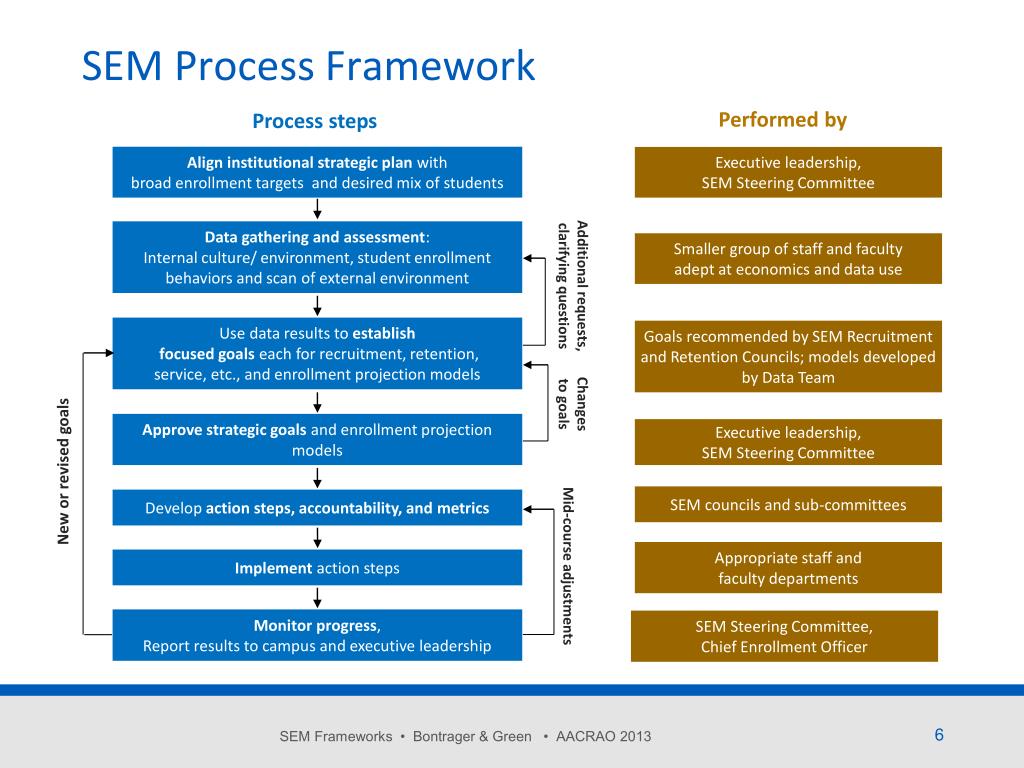 SEM Process Framework Performed by Process steps Align institutional strategic plan with broad enrollment targets and desired mix of students Executive leadership, SEM Steering Committee Data gathering and assessment: Internal culture/ environment, student enrollment behaviors and scan of external environment Smaller group of staff and faculty adept at economics and data use Additional requests, clarifying questions Use data results to establish focused goals each for recruitment, retention, service, etc., and enrollment projection models Goals recommended by SEM Recruitment and Retention Councils; models developed by Data Team Changes to goals Approve strategic goals and enrollment projection models Executive leadership, SEM Steering Committee New or revised goals SEM councils and sub-committees Develop action steps, accountability, and metrics Appropriate staff and faculty departments Implement action steps Mid-course adjustments • Monitor progress, • Report results to campus and executive leadership SEM Steering Committee, Chief Enrollment Officer