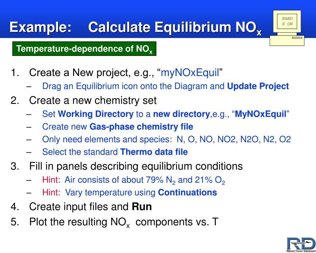 Example: Calculate Equilibrium NOx HANDS ON Temperature-dependence of NOx • Create a New project, e.g., “myNOxEquil” • Drag an Equilibrium icon onto the Diagram and Update Project • Create a new chemistry set • Set Working Directory to a new directory,e.g., “MyNOxEquil” • Create new Gas-phase chemistry file • Only need elements and species: N, O, NO, NO2, N2O, N2, O2 • Select the standard Thermodata file • Fill in panels describing equilibrium conditions • Hint: Air consists of about 79% N2 and 21% O2 • Hint: Vary temperature using Continuations • Create input files and Run • Plot the resulting NOx components vs. T