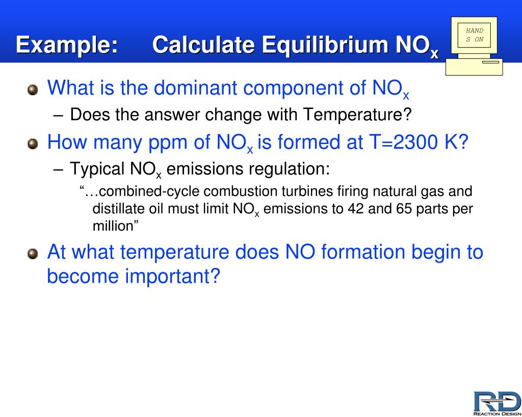 Example: Calculate Equilibrium NOx HANDS ON • What is the dominant component of NOx • Does the answer change with Temperature? • How many ppm of NOx is formed at T=2300 K? • Typical NOx emissions regulation: “…combined-cycle combustion turbines firing natural gas and distillate oil must limit NOx emissions to 42 and 65 parts per million” • At what temperature does NO formation begin to become important?