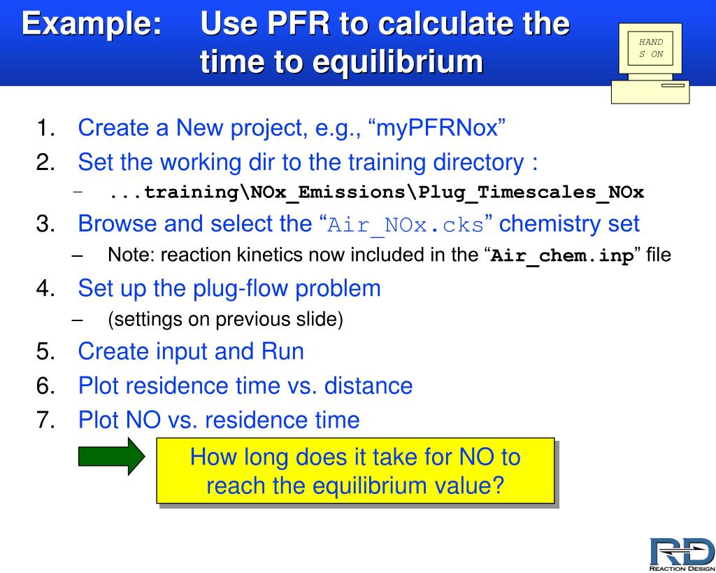 Example: Use PFR to calculate the time to equilibrium HANDS ON • Create a New project, e.g., “myPFRNox” • Set the working dir to the training directory : • ...training\NOx_Emissions\Plug_Timescales_NOx • Browse and select the “Air_NOx.cks” chemistry set • Note: reaction kinetics now included in the “Air_chem.inp” file • Set up the plug-flow problem • (settings on previous slide) • Create input and Run • Plot residence time vs. distance • Plot NO vs. residence time How long does it take for NO to reach the equilibrium value?
