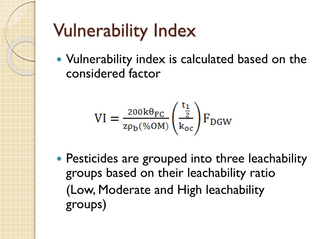 Vulnerability Index • Vulnerability index is calculated based on the considered factor • Pesticides are grouped into three leachability groups based on their leachability ratio (Low, Moderate and High leachability groups)