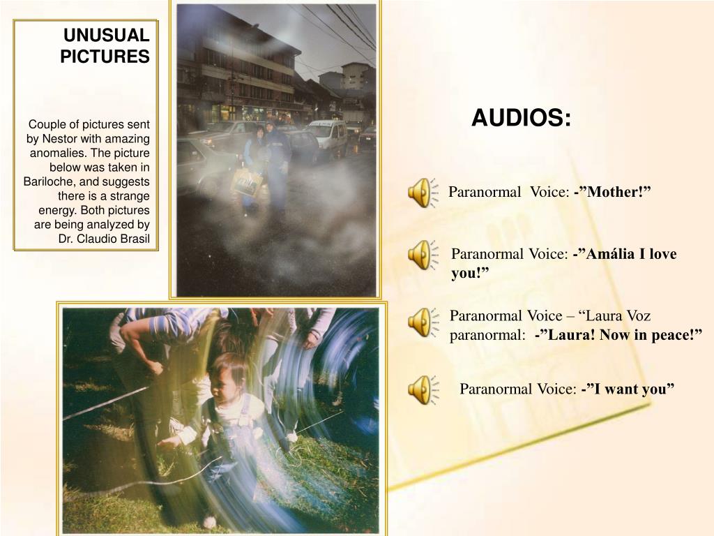 UNUSUAL PICTURES Couple of pictures sent by Nestor with amazing anomalies. The picture below was taken in Bariloche, and suggests there is a strange energy. Both pictures are being analyzed by Dr. Claudio Brasil AUDIOS: Paranormal Voice: -”Mother!” Paranormal Voice: -”Amália I love you!” Paranormal Voice – “Laura Voz paranormal: -”Laura! Now in peace!” Paranormal Voice: -”I want you”
