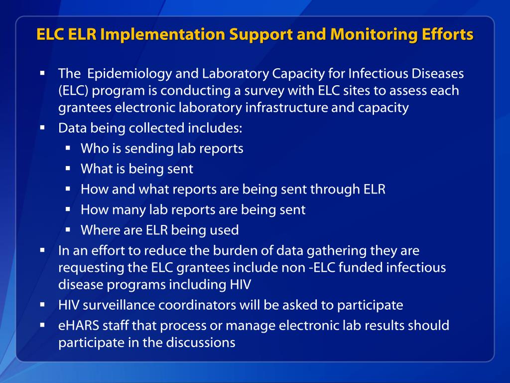 ELC ELR Implementation Support and Monitoring Efforts The Epidemiology and Laboratory Capacity for Infectious Diseases (ELC) program is conducting a survey with ELC sites to assess each grantees electronic laboratory infrastructure and capacity Data being collected includes: Who is sending lab reports What is being sent How and what reports are being sent through ELR How many lab reports are being sent Where are ELR being used In an effort to reduce the burden of data gathering they are requesting the ELC grantees include non -ELC funded infectious disease programs including HIV HIV surveillance coordinators will be asked to participate eHARS staff that process or manage electronic lab results should participate in the discussions