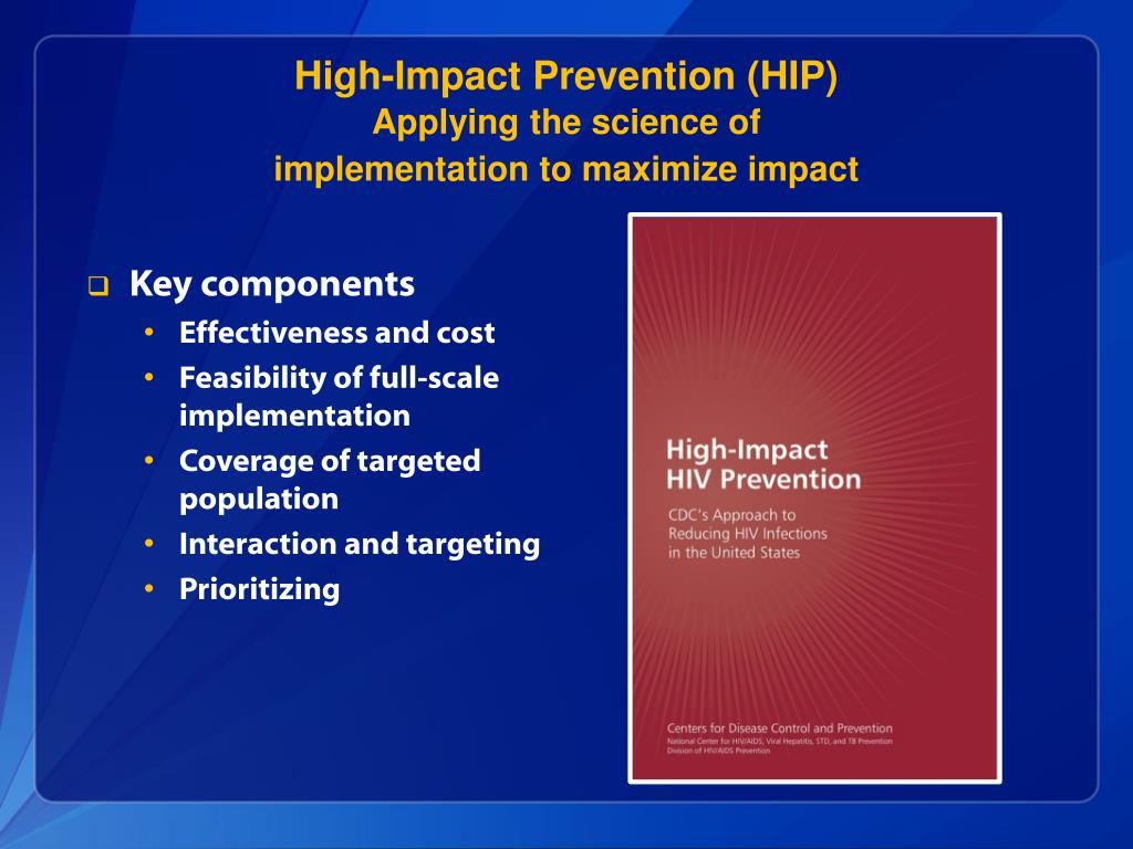 High-Impact Prevention (HIP)Applying the science of implementation to maximize impact Key components • Effectiveness and cost • Feasibility of full-scale implementation • Coverage of targeted population • Interaction and targeting • Prioritizing