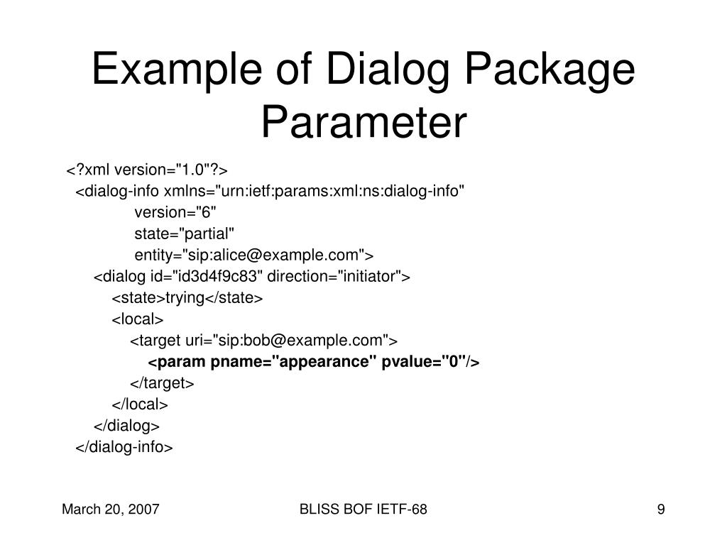 Example of Dialog Package Parameter <?xml version="1.0"?> <dialog-info xmlns="urn:ietf:params:xml:ns:dialog-info" version="6" state="partial" entity="sip:alice@example.com"> <dialog id="id3d4f9c83" direction="initiator"> <state>trying</state> <local> <target uri="sip:bob@example.com"> <param pname="appearance" pvalue="0"/> </target> </local> </dialog> </dialog-info> BLISS BOF IETF-68