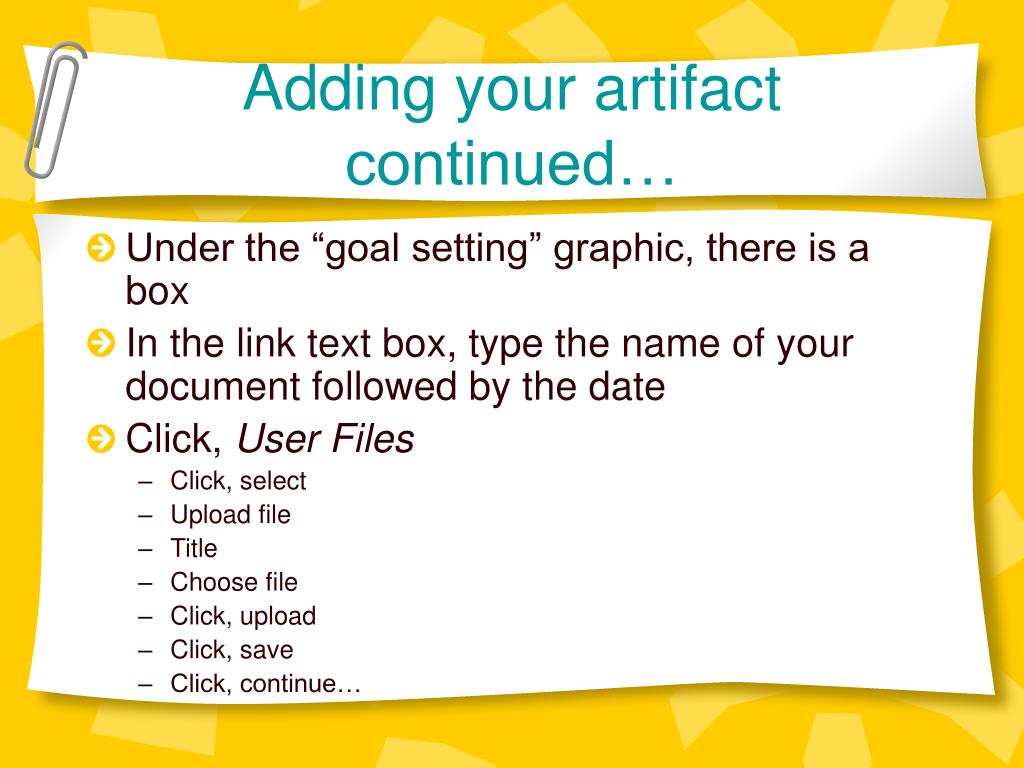 Adding your artifact continued… • Under the “goal setting” graphic, there is a box • In the link text box, type the name of your document followed by the date • Click, User Files • Click, select • Upload file • Title • Choose file • Click, upload • Click, save • Click, continue…