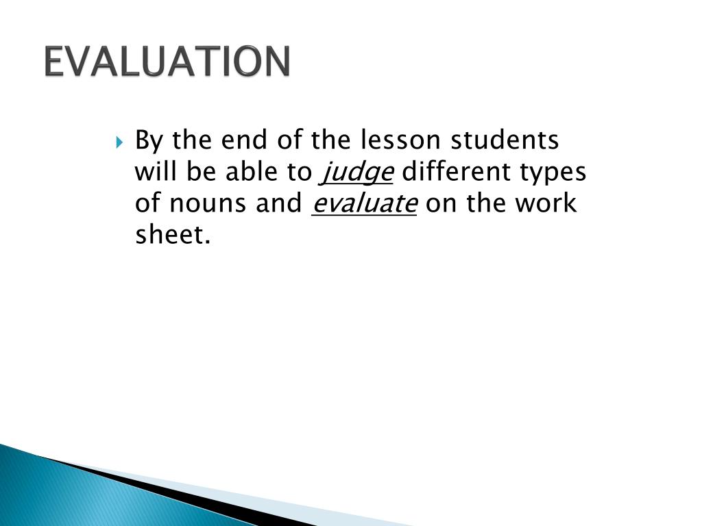 EVALUATION • By the end of the lesson students will be able to judge different types of nouns and evaluate on the work sheet.