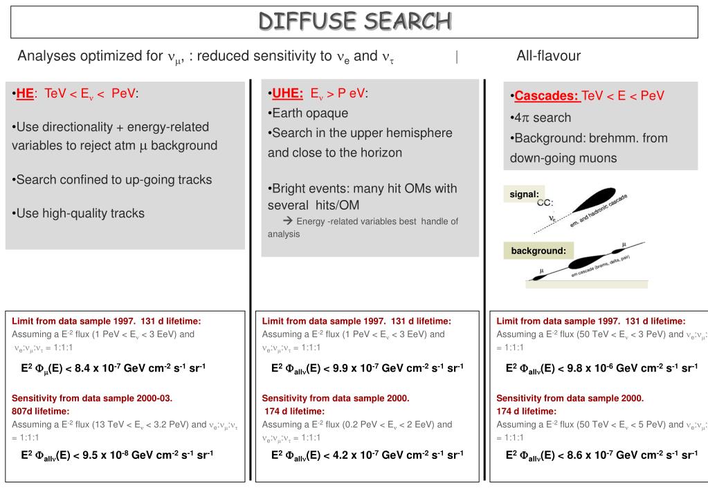 signal: background: DIFFUSE SEARCH Analyses optimized for nm, : reduced sensitivity to ne and nt | All-flavour • UHE: En > P eV: • Earth opaque • Search in the upper hemisphere and close to the horizon • Bright events: many hit OMs with several hits/OM • Energy -related variables best handle of analysis • HE: TeV < En < PeV: • Use directionality + energy-related • variables to reject atm m background • Search confined to up-going tracks • Use high-quality tracks • Cascades: TeV < E < PeV • 4p search • Background: brehmm. from down-going muons Limit from data sample 1997. 131 d lifetime: Assuming a E-2 flux (1 PeV < En < 3 EeV) and ne:nm:nt = 1:1:1 E2Fm(E) < 8.4 x 10-7 GeV cm-2 s-1 sr-1 Sensitivity from data sample 2000-03. 807d lifetime: Assuming a E-2 flux (13 TeV < En < 3.2 PeV) and ne:nm:nt = 1:1:1 E2Falln(E) < 9.5 x 10-8 GeV cm-2 s-1 sr-1 Limit from data sample 1997. 131 d lifetime: Assuming a E-2 flux (1 PeV < En < 3 EeV) and ne:nm:nt = 1:1:1 E2Falln(E) < 9.9 x 10-7 GeV cm-2 s-1 sr-1 Sensitivity from data sample 2000. 174 d lifetime: Assuming a E-2 flux (0.2 PeV < En < 2 EeV) and ne:nm:nt = 1:1:1 E2Falln(E) < 4.2 x 10-7 GeV cm-2 s-1 sr-1 Limit from data sample 1997. 131 d lifetime: Assuming a E-2 flux (50 TeV < En < 3 PeV) and ne:nm:nt = 1:1:1 E2Falln(E) < 9.8 x 10-6 GeV cm-2 s-1 sr-1 Sensitivity from data sample 2000. 174 d lifetime: Assuming a E-2 flux (50 TeV < En < 5 PeV) and ne:nm:nt = 1:1:1 E2Falln(E) < 8.6 x 10-7 GeV cm-2 s-1 sr-1