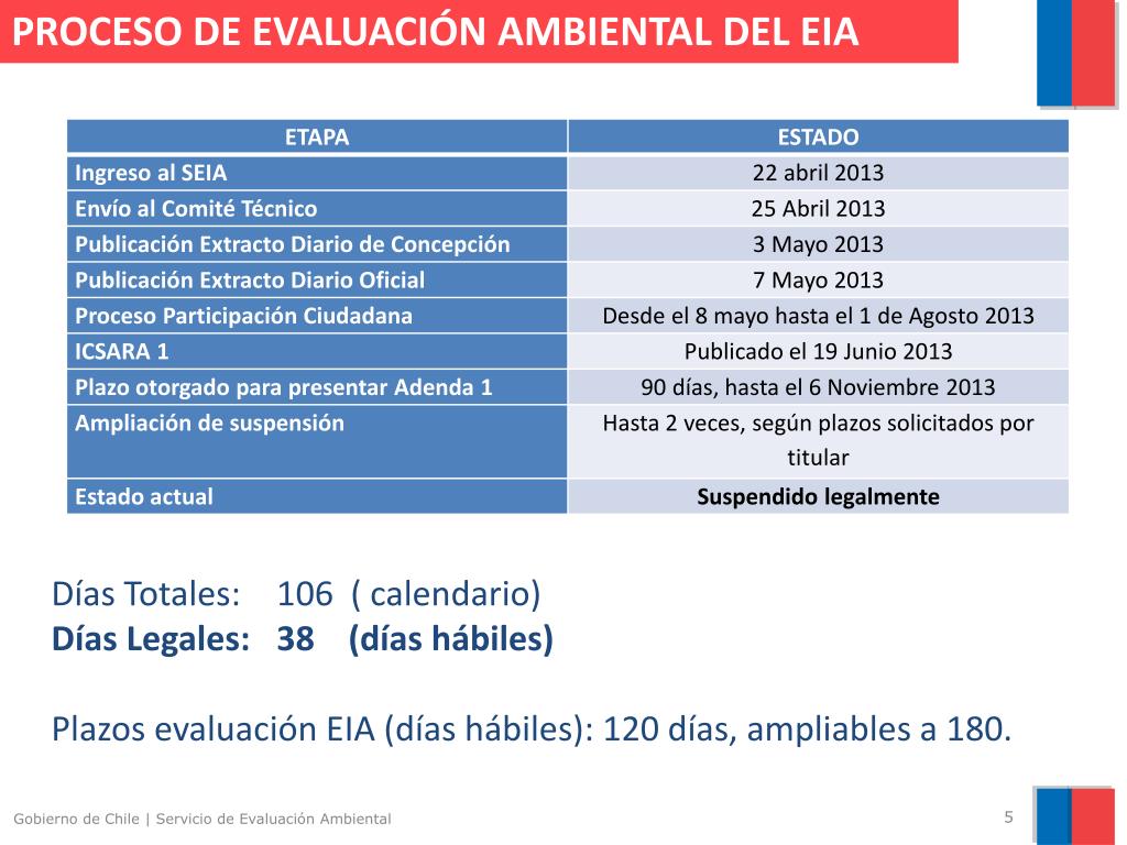PROCESO DE EVALUACIÓN AMBIENTAL DEL EIA Días Totales: 106 ( calendario) Días Legales: 38 (días hábiles) Plazos evaluación EIA (días hábiles): 120 días, ampliables a 180. Gobierno de Chile | Servicio de Evaluación Ambiental