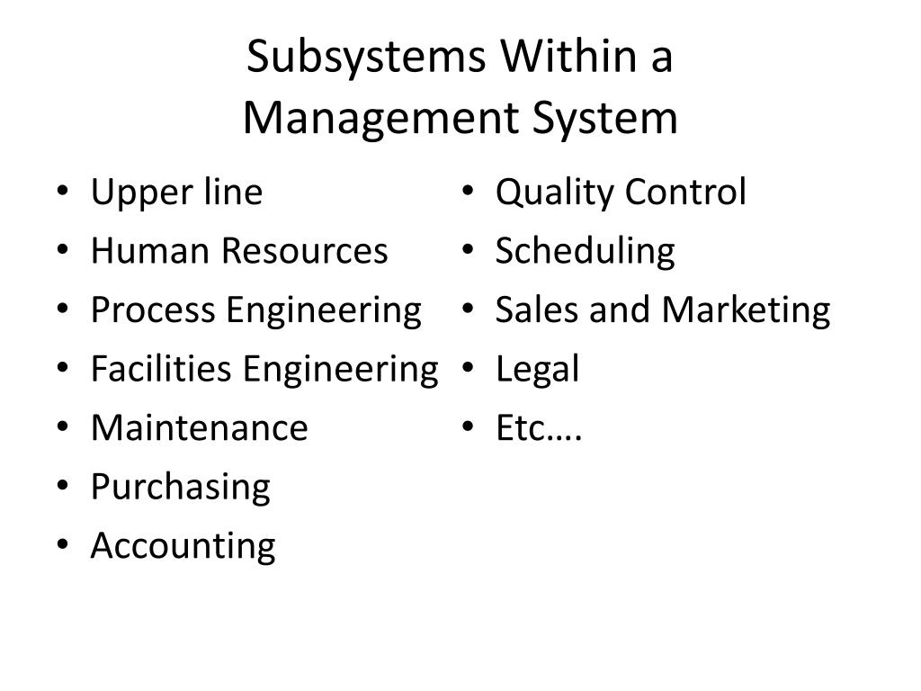 Subsystems Within a Management System • Upper line • Human Resources • Process Engineering • Facilities Engineering • Maintenance • Purchasing • Accounting • Quality Control • Scheduling • Sales and Marketing • Legal • Etc….