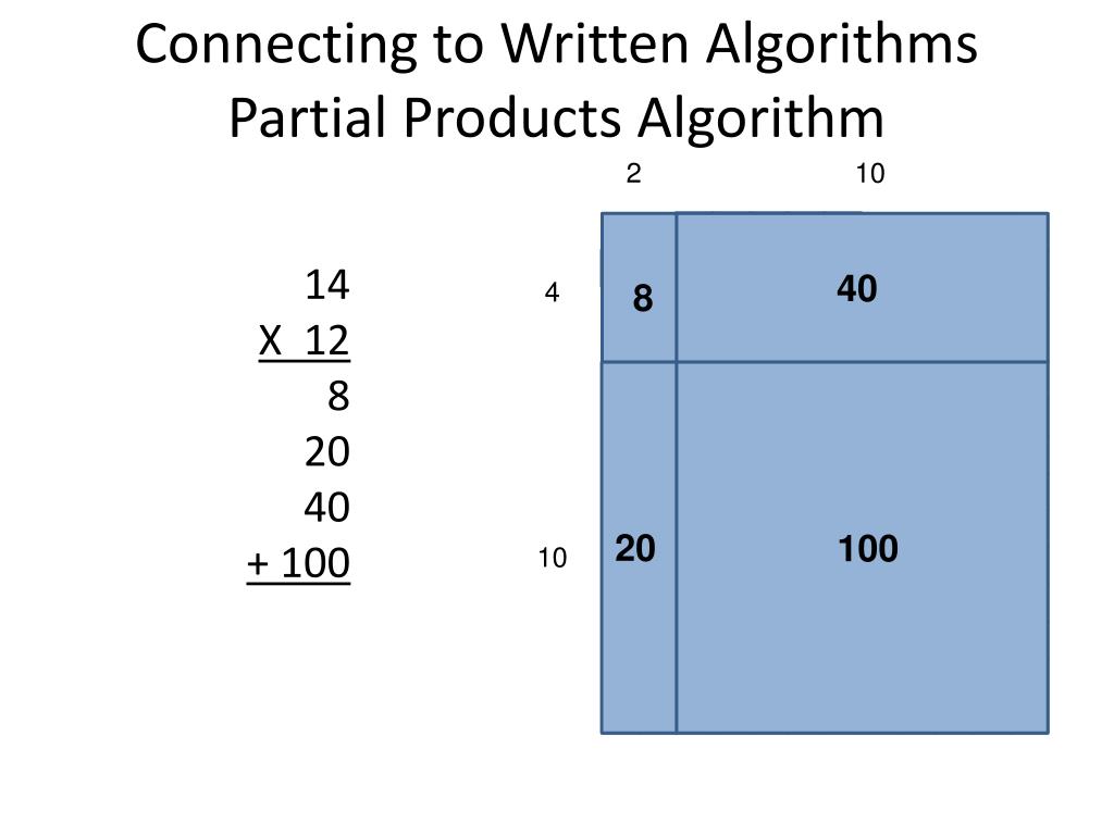 Connecting to Written Algorithms Partial Products Algorithm 2 10 14 X 12 8 20 40 + 100 40 4 8 20 100 10