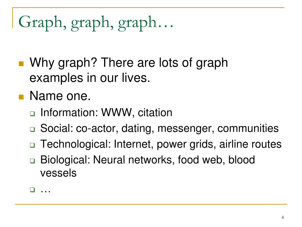 Graph, graph, graph… • Why graph? There are lots of graph examples in our lives. • Name one. • Information: WWW, citation • Social: co-actor, dating, messenger, communities • Technological: Internet, power grids, airline routes • Biological: Neural networks, food web, blood vessels • …