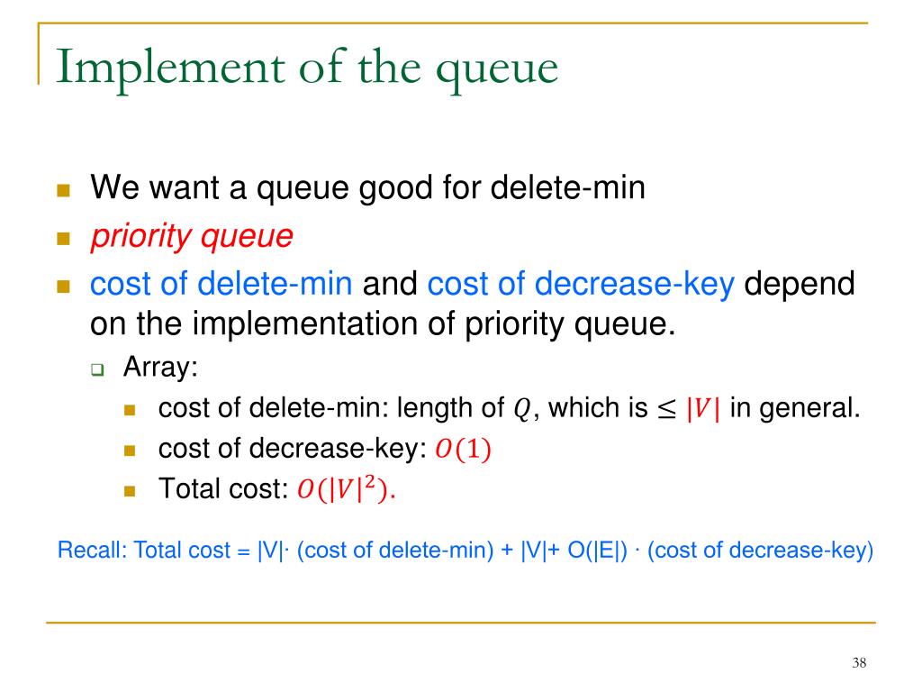 Implement of the queue • We want a queue good for delete-min • priority queue • cost of delete-min and cost of decrease-key depend on the implementation of priority queue. • Array: • cost of delete-min: length of , which is in general. • cost of decrease-key: • Total cost: . Recall: Total cost =|V|∙ (cost of delete-min) + |V|+ O(|E|) ∙ (cost of decrease-key)