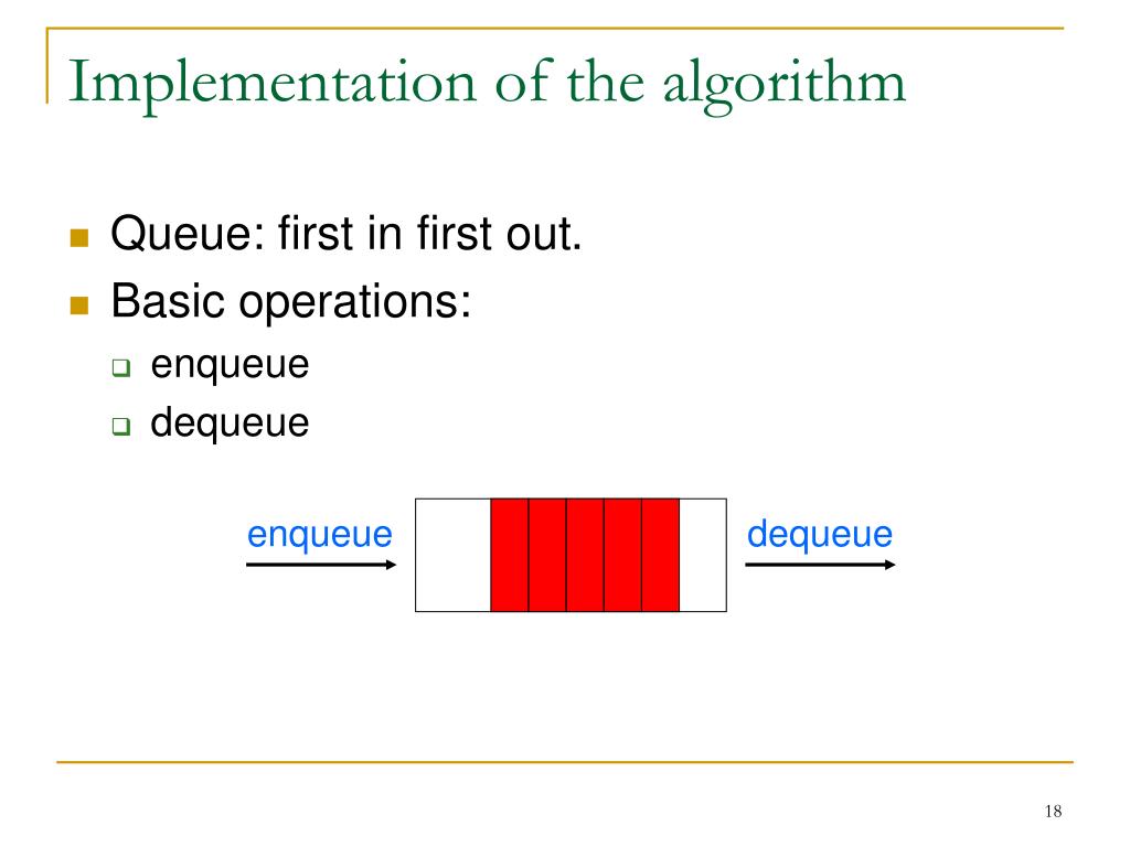 Implementation of the algorithm • Queue: first in first out. • Basic operations: • enqueue • dequeue enqueue dequeue